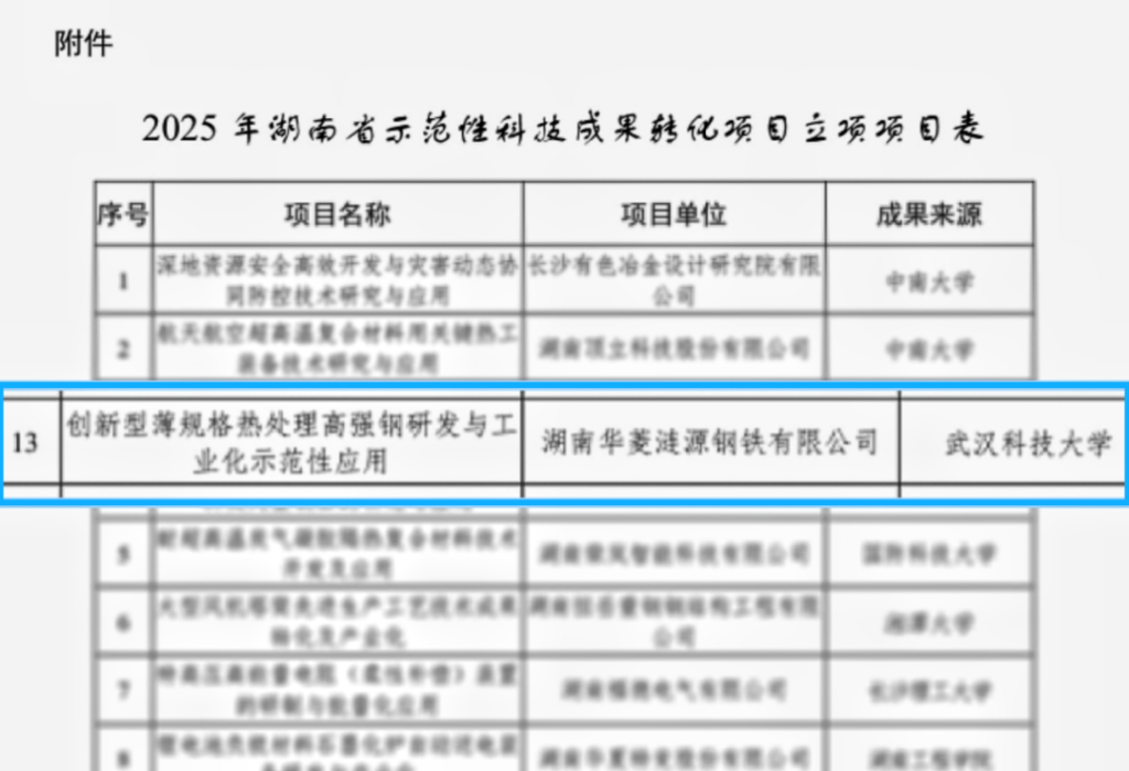 Recently, the Hunan Provincial Department of Science and Technology approved 15 provincial-level demonstration scientific and technological achievements transformation projects for 2025. After application recommendation, formal review and other procedures, it was decided to approve Liangang’s “Innovative Thin-Gauge Heat-Treated High-Strength Steel Research and Development and Industrial Demonstration Application” and other 2025 Hunan Demonstration Scientific and Technological Achievements Transformation Projects.